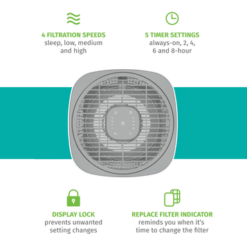 - Super absorbent carbon filter eliminates airborne toxins and odors including smoke, fumes, VOCs, cooking, and pet smells